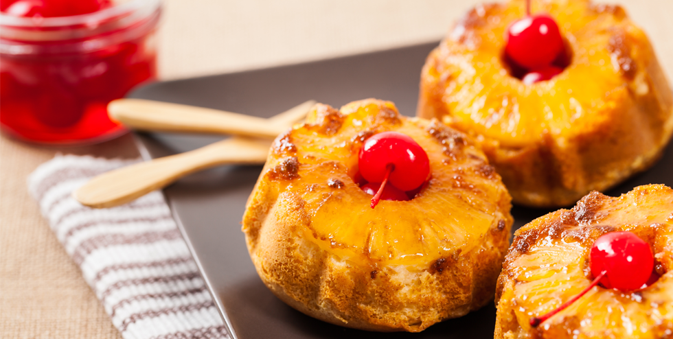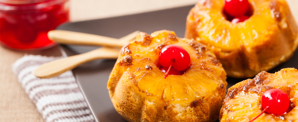 1)Precalienta el horno a 180 °C/350 °F/número 4 (en horno de gas). 2)Engrasa 6 moldes para magdalenas con los 45 g de mantequilla derretida y espolvorear el azúcar moreno oscuro suave en cada molde. 3)Añade una rodaja de piña a cada molde de magdalena que haya sido engrasado con la mantequilla y el azúcar. 4)En un bol para mezclar grande, mezcla bien la harina, el azúcar, la mantequilla, los huevos, la vainilla y los 50 ml de zumo de piña reservado. 5)Vierte la mezcla de pastel sobre la piña, llenando cada molde hasta 2/3 de su capacidad. Hornéalos en el horno precalentado durante 25-30 minutos hasta que estén hechos. Para comprobarlo, inserta una brocheta. Si sale limpia sabrás que los pasteles están hechos. 6)En cuanto estén hechos, déjalos bocabajo sobre una rejilla para que se enfríen. Coloca una cereza en el centro de cada anillo de piña y sírvelos.